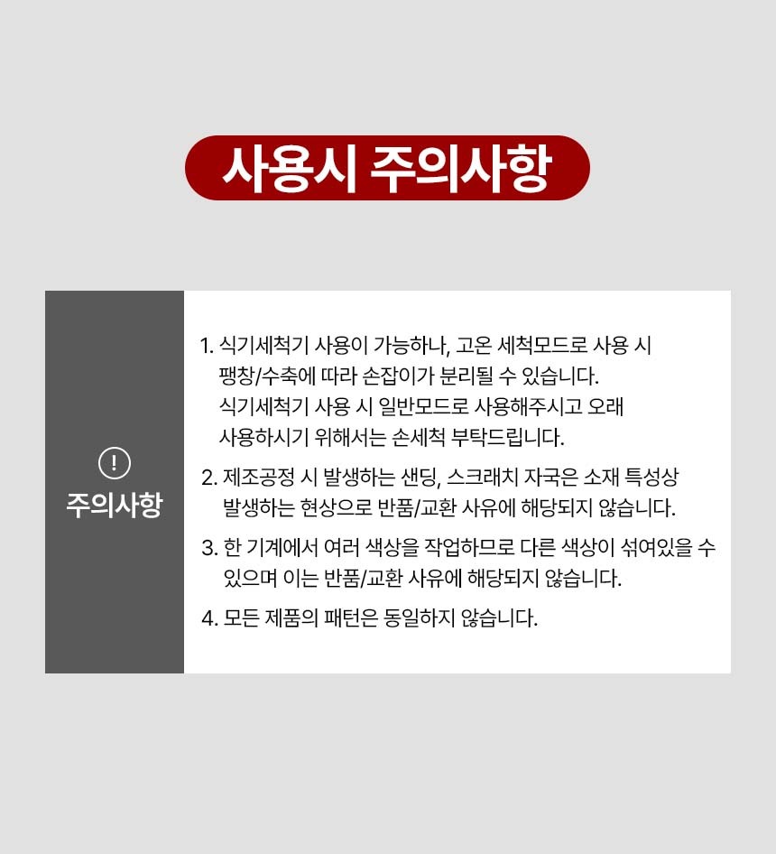 - 파손으로 인한 교환 반품 시, 확인을 위해 [배송 외 포장 상자의 운송장 / 파손 부위] 사진이 반드시 필요 합니다. 해당 증빙이 없을 시, 교환이나 반품 처리가 어려울 수 있습니다.