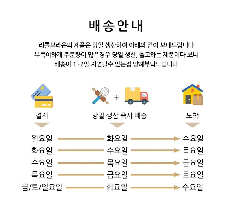 - 영업일 오전 11시 이전 주문 완료건에 대해서는 제품 보유 상황에 따라 최소 1-2일 내 발송됩니다. 배송 완료까지 발송일 기준으로 2-3일의 영업일이 소요됩니다. (단, 주말, 공휴일 제외 모든 기간에는 택배사 사정에 따라 발송일 및 배송 완료일의 차이가 있을 수 있습니다.